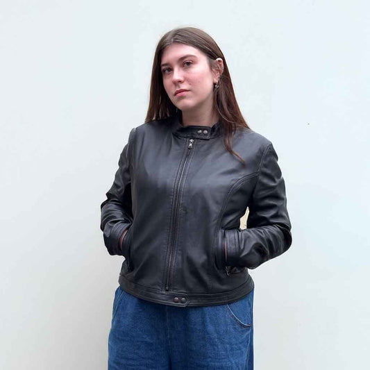 Jewel Neck Leather Jacket - Brown
